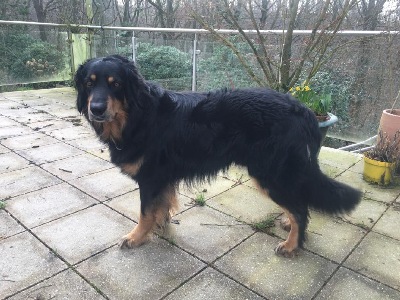 Nestor vom Büssemfeld ist ein schwarzmarkener Rüde vom derben Typ, mit kräftigem Kopf und komplettem Scherengebiss. Behänge, Rücken, Rute und Hoden sind in Ordnung, seine Winkelungen sind korrekt. Er hat eine vorzügliche Fellstruktur und eine korrekte Markenzeichnung mit durchgehend schöner Markenfarbe. Der Rüde zeigt ein flüssiges Gangwerk und präsentiert sich freundlich und sehr temeramentvoll im Ring. (Richterberich) Auf Ausstellungen wurde er bis jetzt mit V2 bewertet. Wir haben ihn als tollen Gentleman kennengelernt. Er geht sehr freundlich auf Menschen zu und begrüßt sie herzlichst. Auch bei anderen Hunden ist er kein Raufbold sondern eher der zurückhaltende freundliche Herr. Und mit Mädels spielt er sehr lieb und kann auch vorsichtig sein.-) Natürlich beschützt er auch Haus und Hof so, wie es sich für einen waschechten Hovi gehört. Er arbeitet sehr gerne auf dem Hundeplatz und zeigt eine hervorragende Nasenarbeit. Auch der Schutzdienst macht ihm viel Spaß! Alles in Allem ein Traumrüde von dem wir uns in der Verpaarung mit Hera sehr schöne, gesunde, wesensfeste und temperamentvolle Nachkommen versprechen.